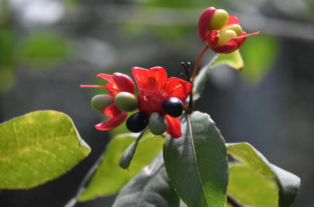 Tropical plant with flowering red blossoms with seed pods that look like berries.