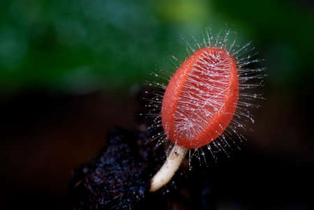 A red hairy mushroom growing out of the timber (Microstoma floccosa (Schw.) Raitv var. floccosa)