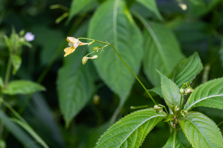 Delicate yellow flowers of Impatiens parviflora emerge amidst rich foliage showing the beauty of nature in a vibrant woodland setting.
