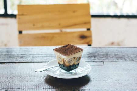 Banoffee Cake with caramelize bananas in cup and ice tea on wood table,Sweet Homemade