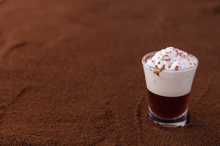 Little cup of piccolo latte macchiato on a table covered with ground coffee as a background