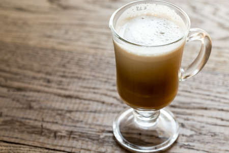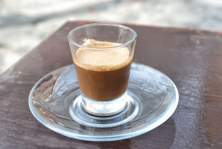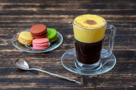 Traditional vietnamese egg coffee made of raw egg yolk and condensed milk, close up. Eggcoffee on wooden table background