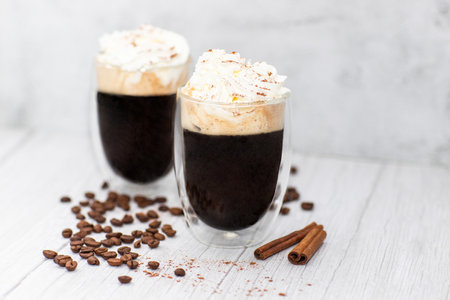 Black coffee with whipped cream on a light wooden table. Drink recipe.