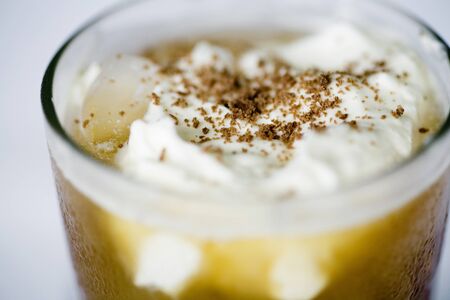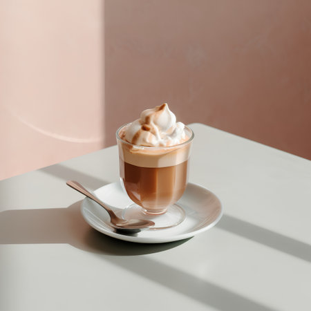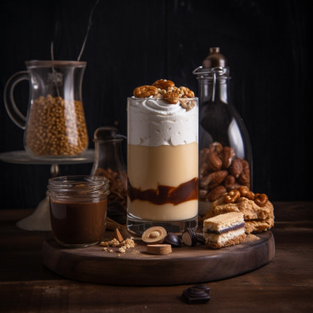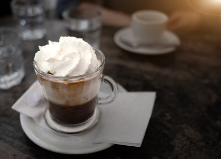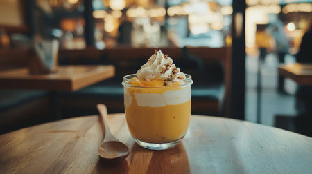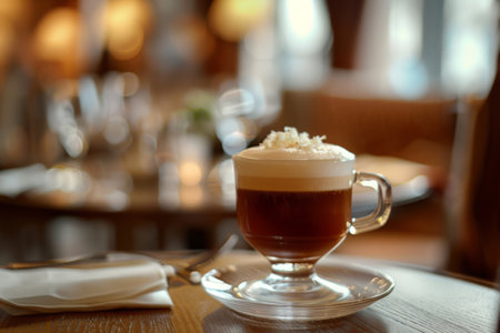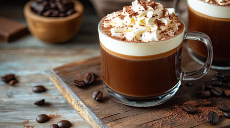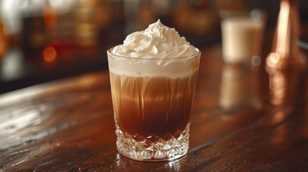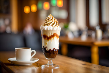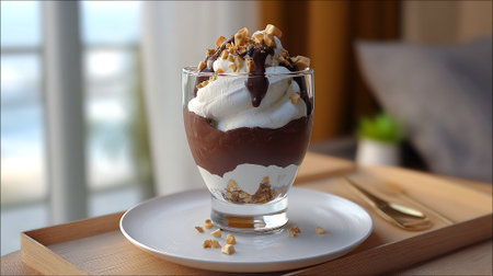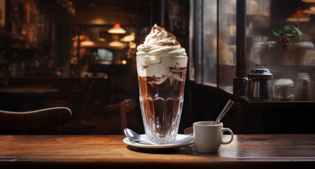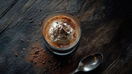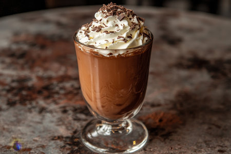 Elegant coffee dessert in a glass with whipped cream topping in cozy ambiance