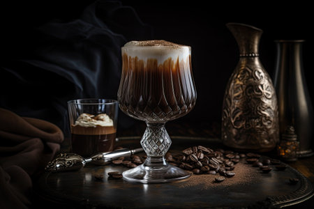 A luxurious coffee drink topped with cream, served in an ornate crystal glass, creating a sophisticated and indulgent atmosphere.