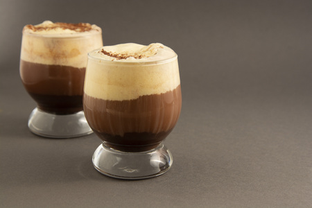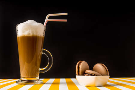 Chocolate macaroni cake, Irish coffee Cup on a black background.