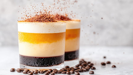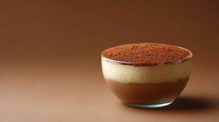 A delectable creamy dessert featuring rich coffee layers topped with a dusting of cocoa powder, elegantly served in a glass bowl on a warm brown background.