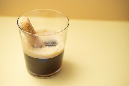 Spongy ladyfinger cookie dipped in espresso coffee, in a transparent glass, on cream color background. Soft focus close up.