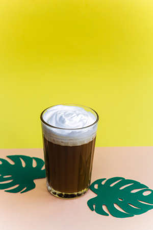 iced coffee and green paper leaves monstera bright yellow orange pastel background