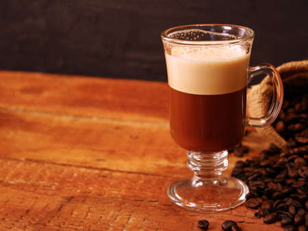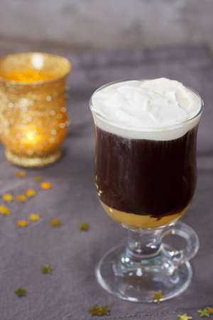 Irish coffee in an outdoor bar. Concept of St Patrick holiday. Holiday background. Irish national day. Warm tone. Vertical