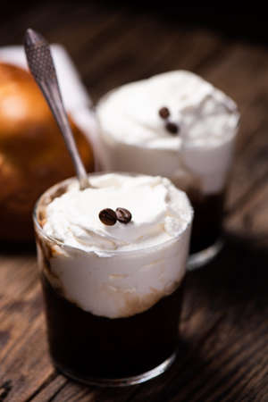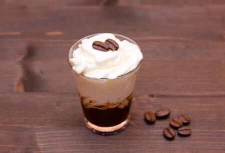 Coffee with Irish whiskey and whipped cream in glass on rustic wooden surface. Espresso Martini Cocktail, refreshing summer cocktail with coffee and Martini in composition