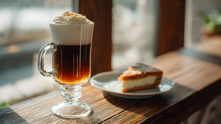 A traditional Irish coffee served in a clear glass mug with whipped cream on top, next to a slice of pie in a cozy café atmosphere.