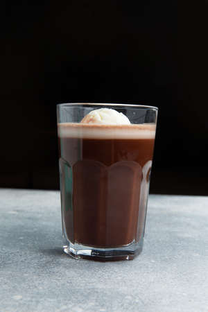 Coffee affogato with vanilla ice cream and espresso. Glass with coffee drink and icecream. Gray background, isolated.
