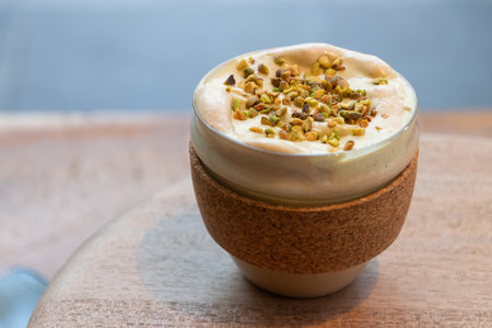 A creamy coffee pistachio dessert topped with chopped pistachio nuts and foam, cozy cup on wooden table