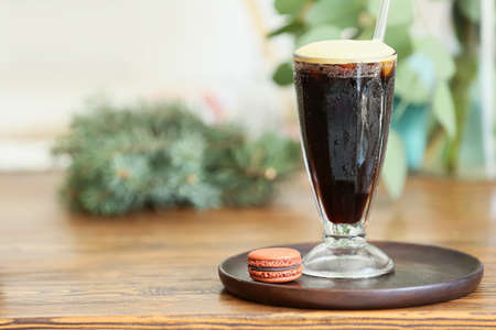 Close-up photo of glass cup with ice latte on the wooden table in a coffee shop. Glass with iced caramel cappuccino with the straw on the table