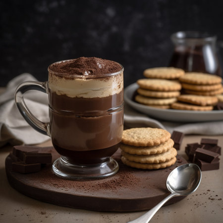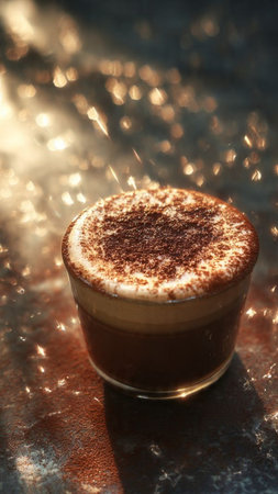 Experience the flavors of Turin, Italy with this traditional bicerin drink, made by layering espresso, chocolate, and cream in a small glass. The aroma is rich and chocolaty, with a hint of sweetness, making it the perfect drink to indulge in. The bicerin is served with a small spoon and garnished with a sprinkle of cocoa powder, which adds a beautiful touch to the overall presentation. Enjoy this classic Italian drink with a plate of cookies or your favorite sweet treat.