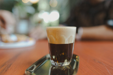 A vibrant cortado served in a clear glass, positioned on a minimal backdrop, showing the rich layers and textures of the coffee in natural light