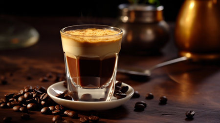 A delicious espresso in a glass cup with a beautiful crema on a wooden table. Generative AI. High quality illustration