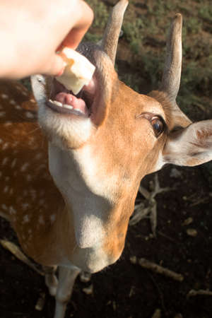 Close-up of a deer at the petting zoo. Feeding the animal with goodies. Tamed and domesticated wild artiodactyla. Young and fluffy horns. The animal's eyes look from behind the cage.