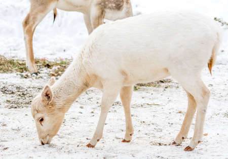 two deer in the snow winter time in the wild close to a salt rock. Deer licking salt stone in Bran, Brasov, Transylvania, Romania