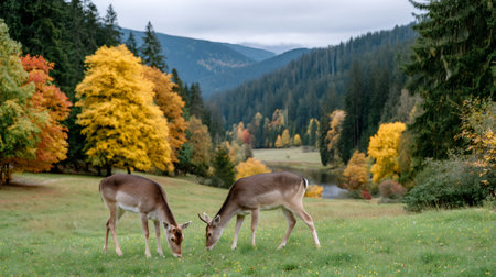 Two deer eating grass in a field with colorful autumn trees and mountains
