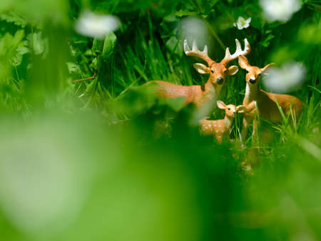 Wild deers outdoors in forest eating grass fearless with cute fawn