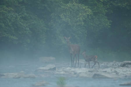 Serene scene of a deer surrounded by dense morning mist in a quiet forest, capturing the beauty and mystery of nature.