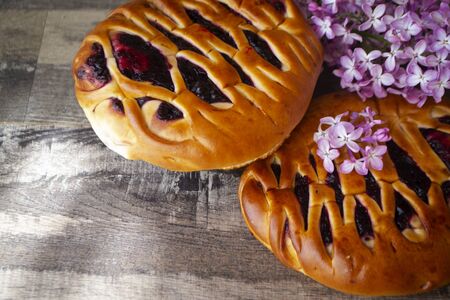 Blackcurrant yeast cake with fresh lilac, traditional russian bun