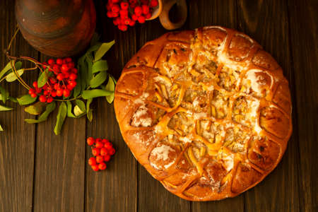 Round sdobny ruddy pie on the background of wooden boards