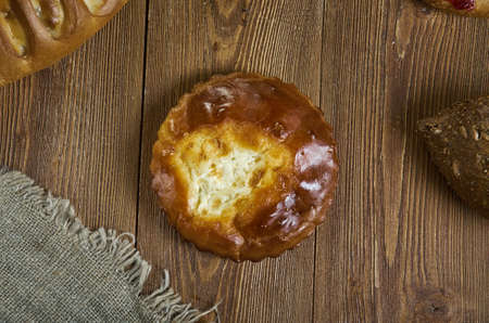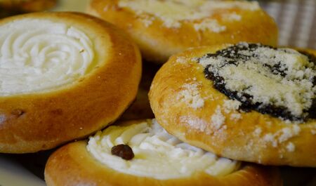 shangi, Russian traditional pies piroshki ,patties with cottage cheese, assorted pastry: dishes, Top view.