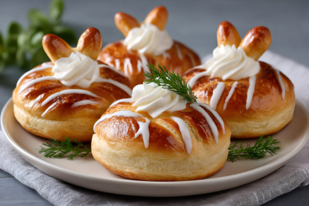 Sweet baked buns shaped like bunnies, topped with cream and drizzle, celebrating Easter
