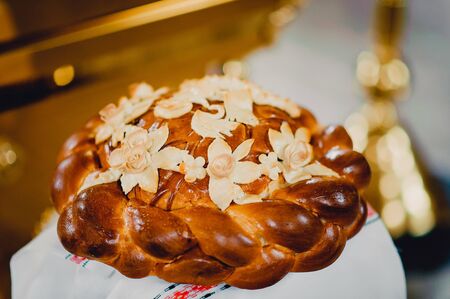 Wedding bread from wheat flour dough on the plate.
