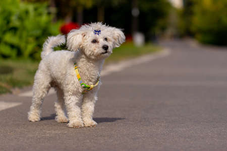 Cute Bichon Frize puppy on a green grass walking in a park. Portrait of a puppy.