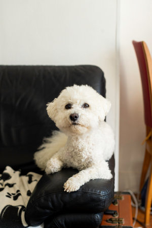 A purebred Bichon Frise dog rests calmly on the black leather armrest of a couch. The photo captures a peaceful moment of a beloved pet in a cozy home environment. Vertical photo