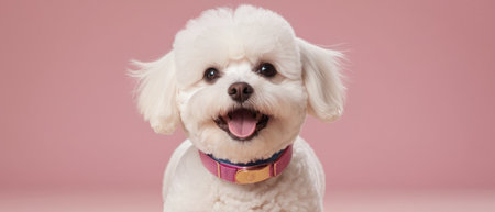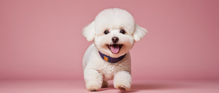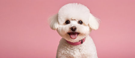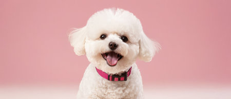 cute joyful Bichon Frise pet dog animal banner with copy space on pink flat background