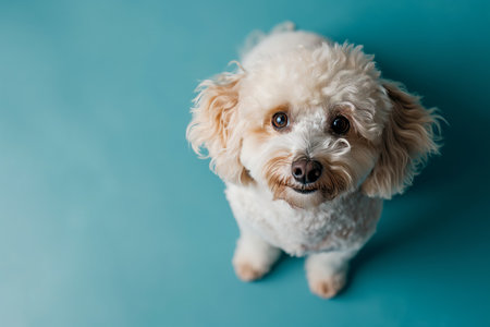 Smiling Poodle With Paw Print In Pastel Backdrop. Concept Pet Portraits, Pastel Backdrops, Paw Print Props, Poodle Poses, Joyful Expressions.
