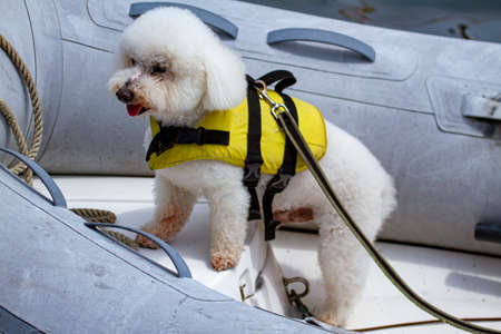 Isolated close up picture of a cute west highland white terrier dog on an inflatable boat. The dog is wearing a yellow life jacket and is on leash which is attached to the boat for safety