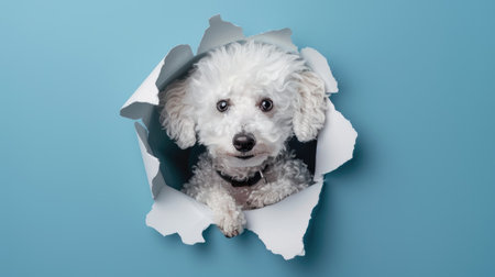 a cute white poodle peeking through a hole in paper, with big eyes gazing at the camera amidst ripped paper, exuding a sense of playful mischief and curiosity