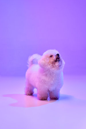 Portrait of fluffy charming dog bichon frize looking up over lilac color background in neon light filter. Dog before grooming. Friend, love, care and animal health concept. Pet looks delighted