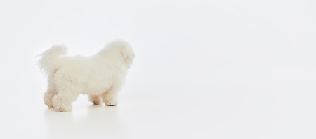 Back view of fluffy dog bichon frize posing over white studio background. Dog before grooming. Concept of care, animal health, visit to vet. Banner with copy space for text, ad