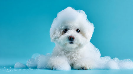 Cheerful White Bichon Frize Puppy Covered in Soap Foam for Playful Photography