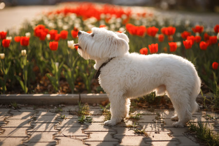 Cute Maltese dog in the field of yellow flowers on a sunny day