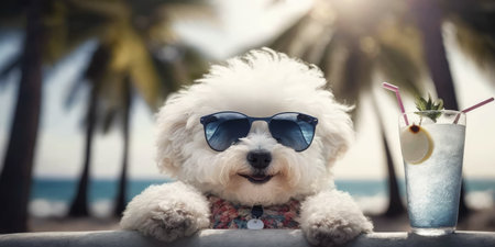 Bichon Frise dog is on summer vacation at seaside resort and relaxing rest on summer beach of Hawaii