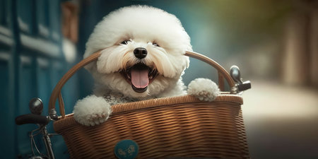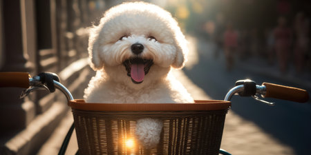 Bichon Frise dog have fun bicycle ride on sunshine day morning in summer on town street