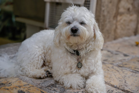 Close-up of a Maltipoo dog lying on the ground outdoors. Focus on pet care, small dog breed, and adorable canine expressions. Face and body visible.