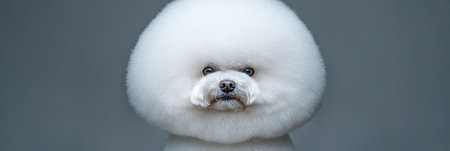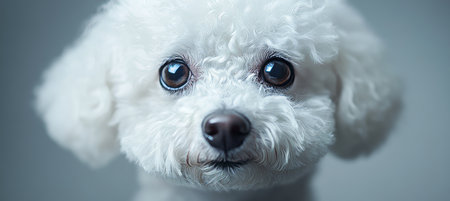 Adorable Bichon Frise Dog Close-Up with Gentle Gaze, Captivating Fur and Expressive Eyes on Gray