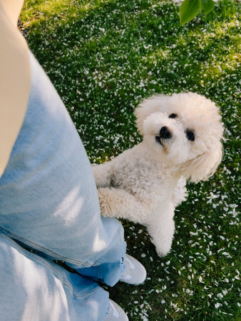Adorable small white dog standing on its hind legs, playfully interacting with its owner amidst picturesque backdrop of springtime blossoms and lush green grass. White puppy balancing on back legs