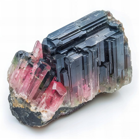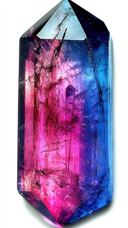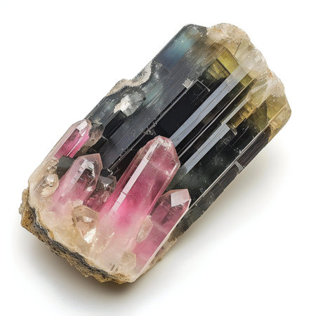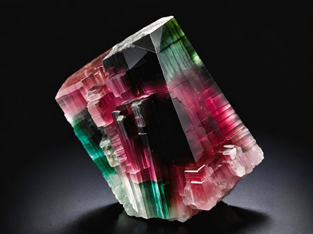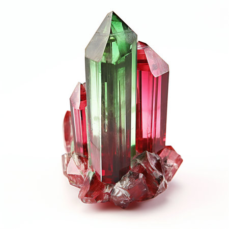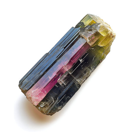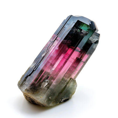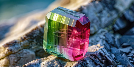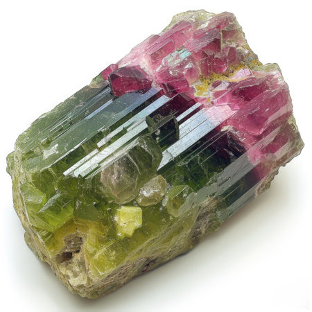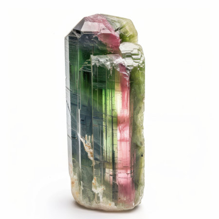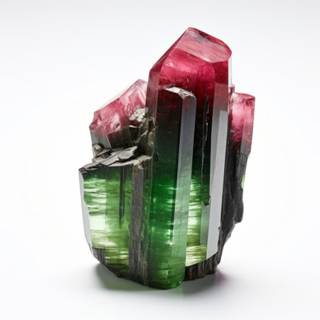 A mesmerizing multicolored tourmaline crystal showcasing vibrant green and pink hues. This striking natural stone is perfect for collectors and enthusiasts alike.
