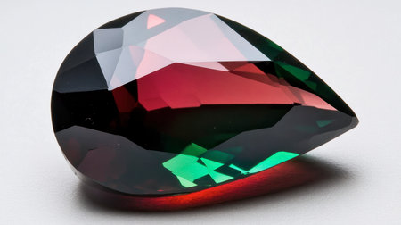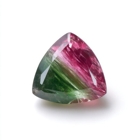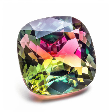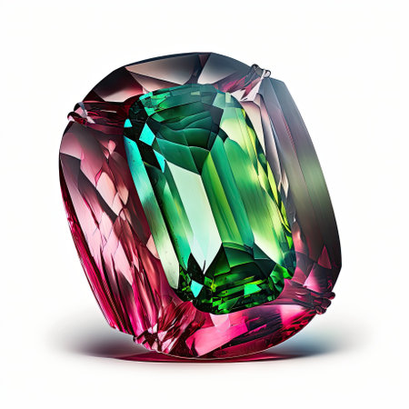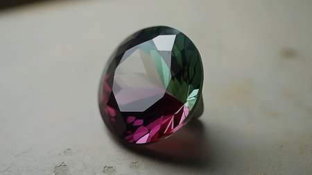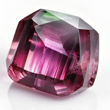 Stunning view of a brilliantly cut gemstone displaying vibrant colors of pink and green. The light reflection showcases its clarity and elegance against a white background.