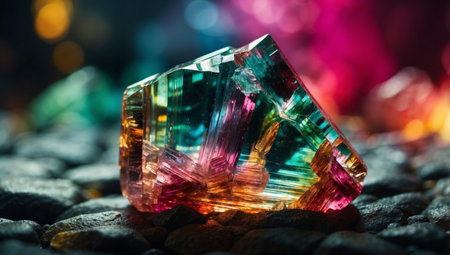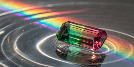 A multicolored crystal rests on a shiny surface, creating mesmerizing reflections and vivid rainbow patterns in the surrounding water ripples. The scene is bright and captivating.